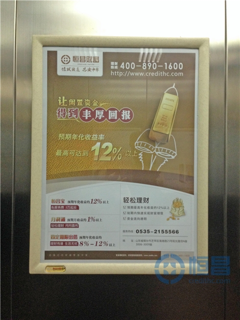 2013年11月11日,恒昌財富煙臺分公司成功將樓宇視頻廣告和電梯框架廣告投放市場。多渠道多方位提升、推廣公司形象、彰顯品牌實力,對更好的開發市場,打好宣傳戰,提高企業知名度起到了重要作用。