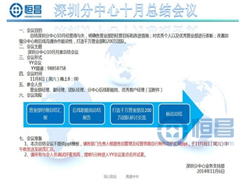 為了建立節(jié)約型會議,并讓全體管理者都能參與到總結會議中來,深圳分公司于 2014年11月8日晚上8點舉辦了YY會議形式的“深圳分公司10月總結會議”。...